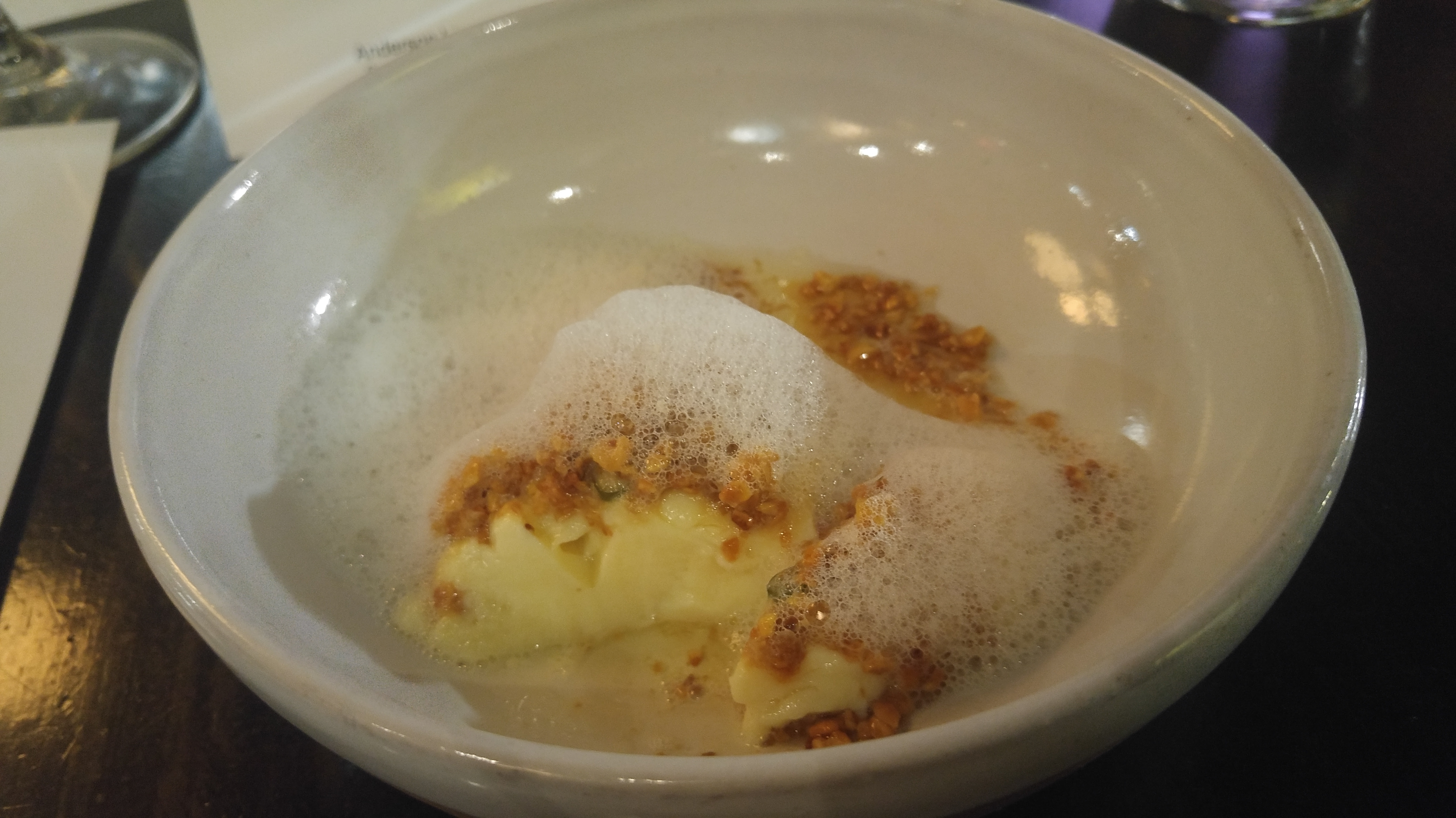 At the top was popped wild rice, a turnip and kelp flake, and pickled seaweed, over a bed of barley in parsley juice. This dish was surprisingly acidic and contrary to the presentation, kind of boring. It didn’t work for me.